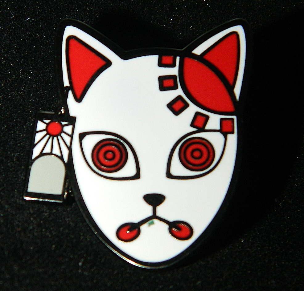 This is a 1.25″ tall x 1.125″ wide metal enamel pin featuring the image of Sabito’s cat face mask from the popular Japanese anime series Demon Slayer. It is in mint, unused condition stored in a smoke and pet free environment.