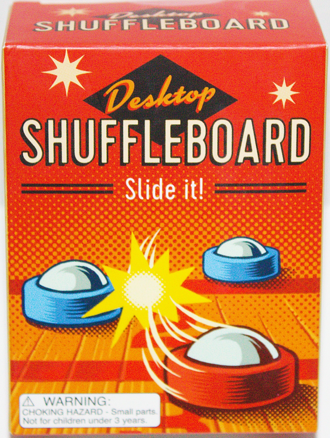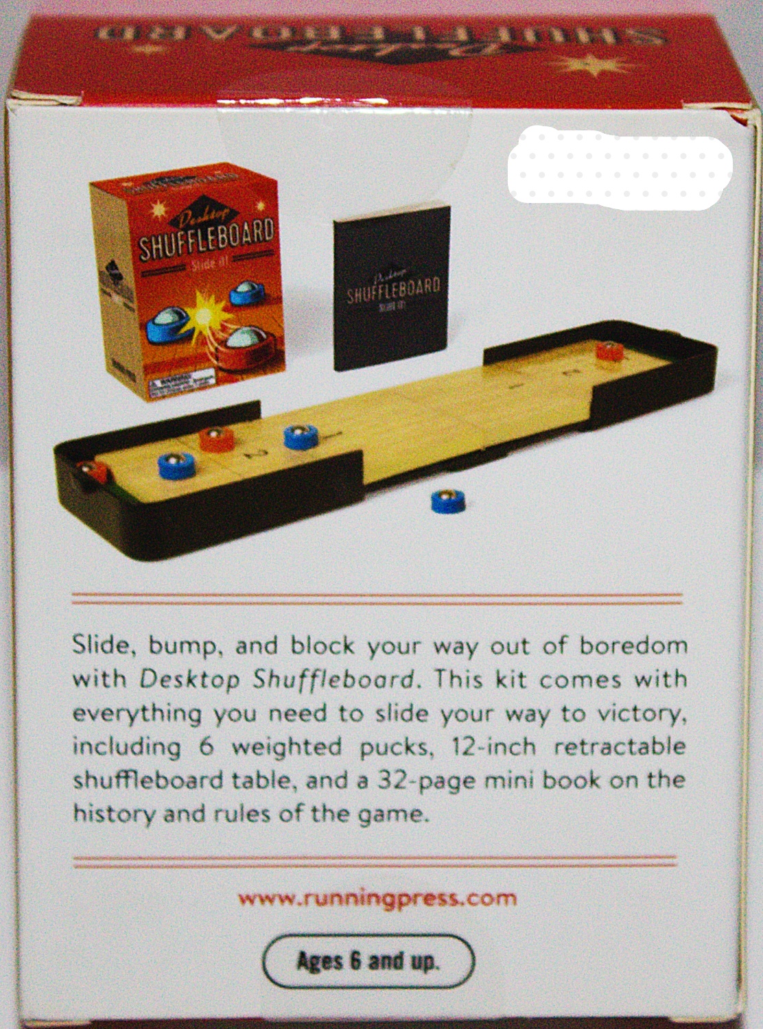 Desktop Shuffleboard serves as the perfect game night addition, travel game, or office distraction! This portable miniature set includes: 12″ extendable shuffleboard platform, with 2 table inserts, 6 (3 red and 3 blue) weighted pucks, Shuffleboard stickers and a 32-page book with trivia and rules of desktop shuffleboard. This is a new, sealed copy that we purchased direct from the publisher and it has been stored in a smoke and pet free environment.