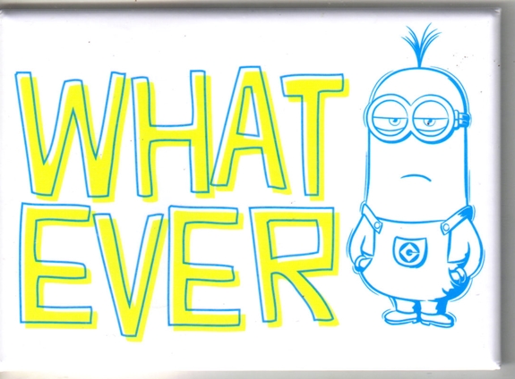 This is a licensed, large 2.5″ x 3.5″ magnet featuring the art image of minion Tim saying “What Ever” from the cult hit movies Despicable Me.