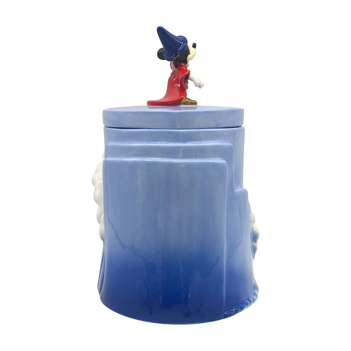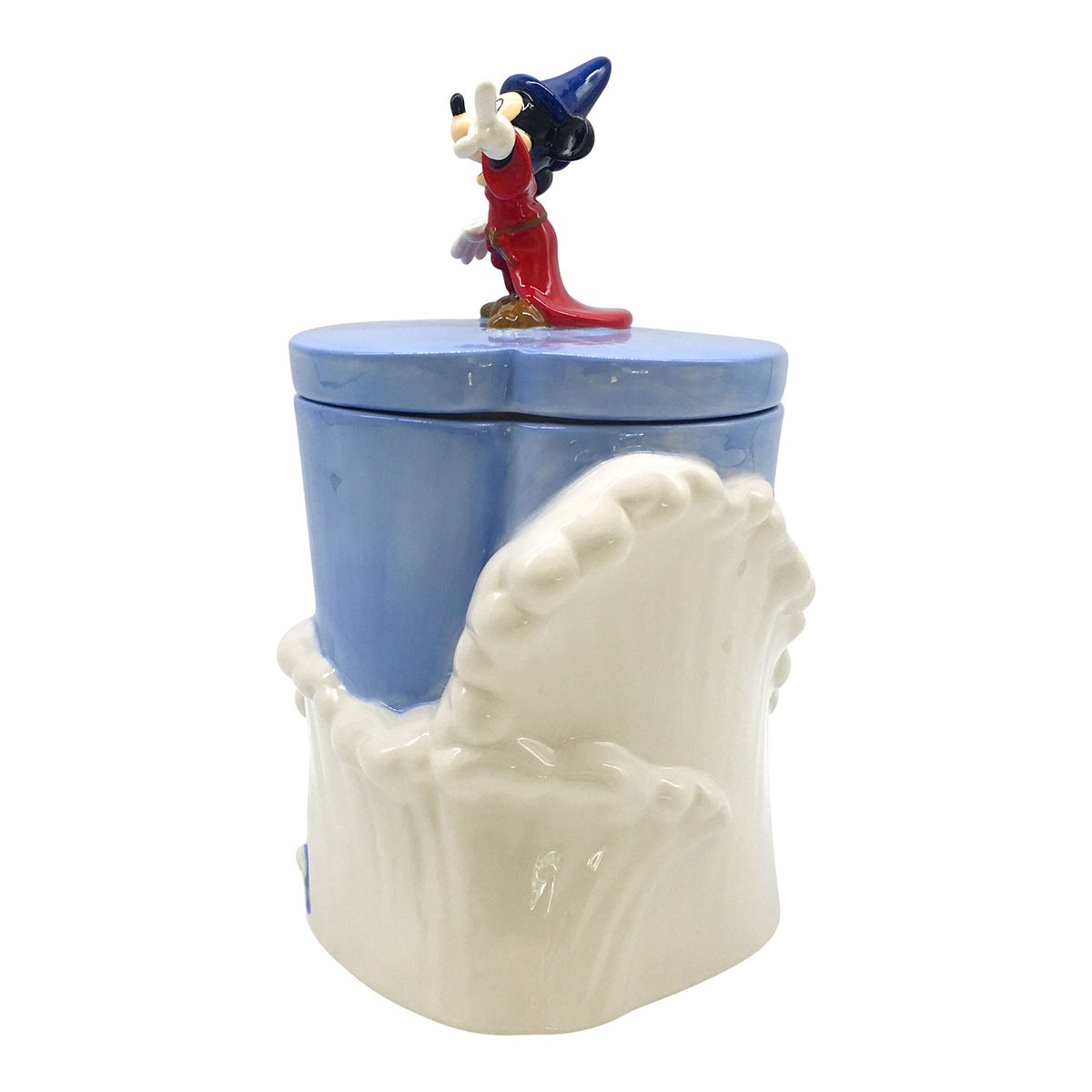 In celebration of the 80th Anniversary of Walt Disney’s 1940 animated masterpiece Fantasia, you too can summon the stars (or at least a few cookies) with this iconic fully sculpted cookie jar featuring Sorcerer Mickey. It is a 10″ tall x 7.75″ x 7.75″ dolomite cookie jar featuring the figure of Mickey Mouse on the removable lid. Hand wash only. This is not dishwasher or microwave safe. It is new and unused, ships in an illustrated box and is stored in a smoke and pet free environment.