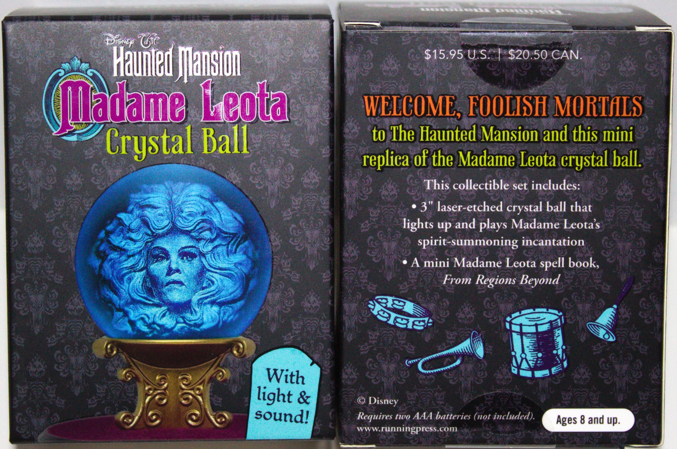 Welcome foolish mortals, to The Haunted Mansion and this spooktacular mini replica of the Madame Leota crystal ball. This is a 3″ laser-etched crystal ball with Madame Leota’s floating head inside; rests on an intricately designed base. When switch is turned on the ball lights up and plays Madame Leota’s spirit-summoning incantation. The set includes a 32-page mini spell book, inspired by Madame Leota’s spell book in The Haunted Mansion. Requires two AAA batteries (not included). This is a new, sealed copy from our files that we purchased directly from the publisher and it has been stored in a smoke and pet free environment.