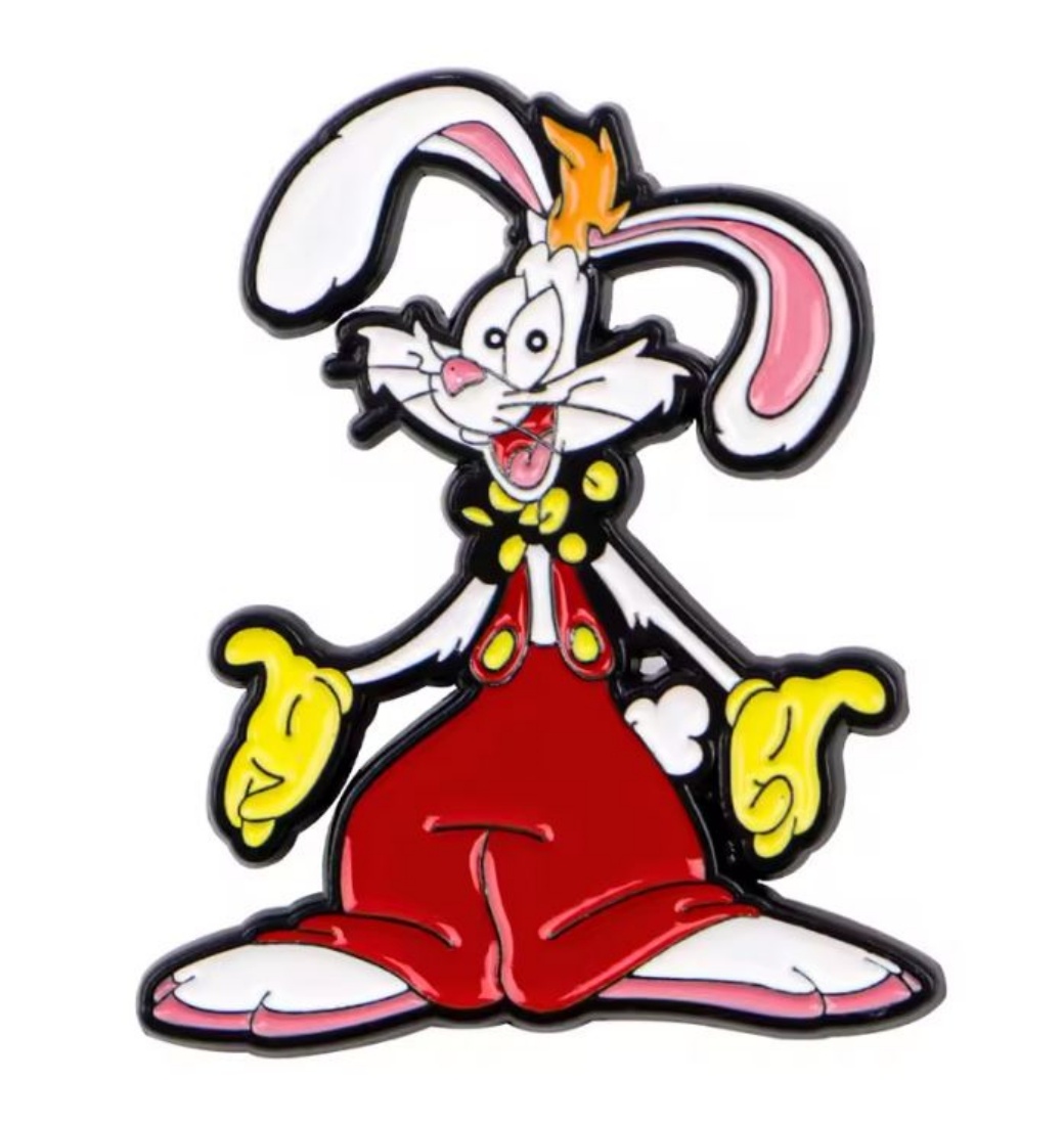 This is a 1.25″ high x 1″ wide colored metal enamel pin featuring the full image of Roger from Walt Disney’s animated movie Who Framed Roger Rabbit. This is a new unused pin still in its original packaging stored in a smoke and pet free environment.