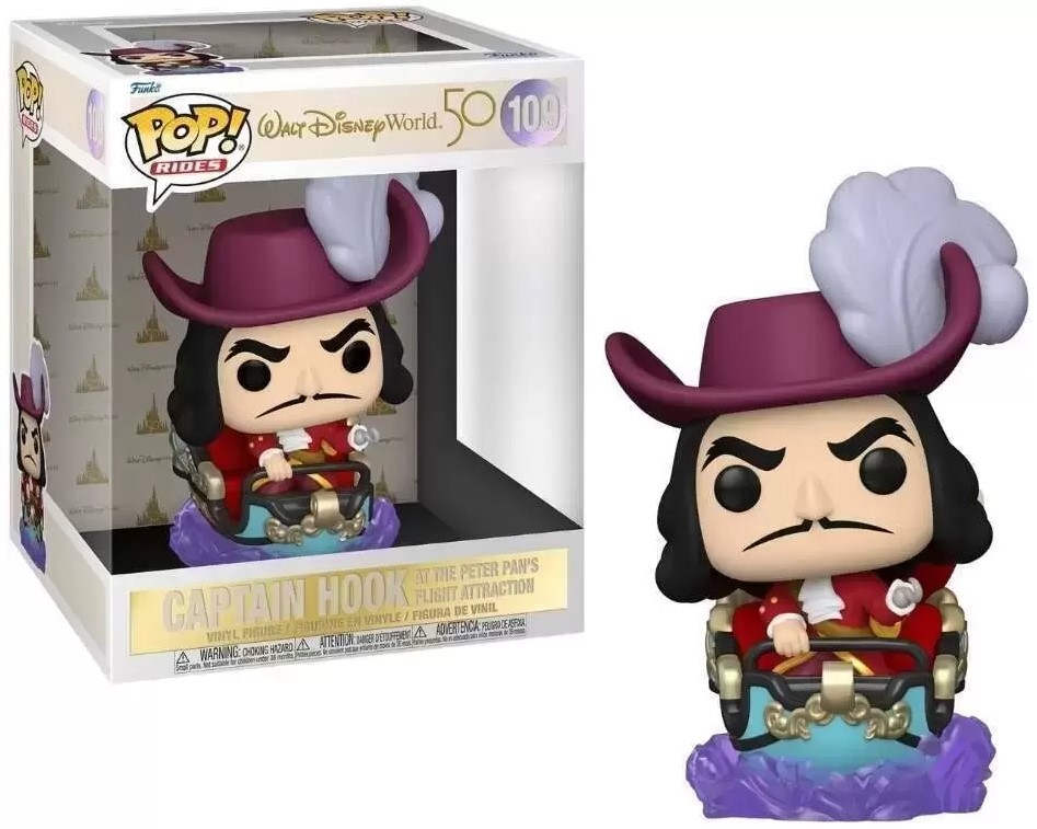This is part of the FUNKO line of POP vinyl ride figures and this series features characters from the rides at Disney World. This features Captain Hook riding on the Disney World Peter Pan’s Flight ride. Produced to celebrate the 50th anniversary of Disney World. This figure comes in a sealed illustrated box with a clear plastic front that displays the toy and it is stored in a smoke and pet free environment.