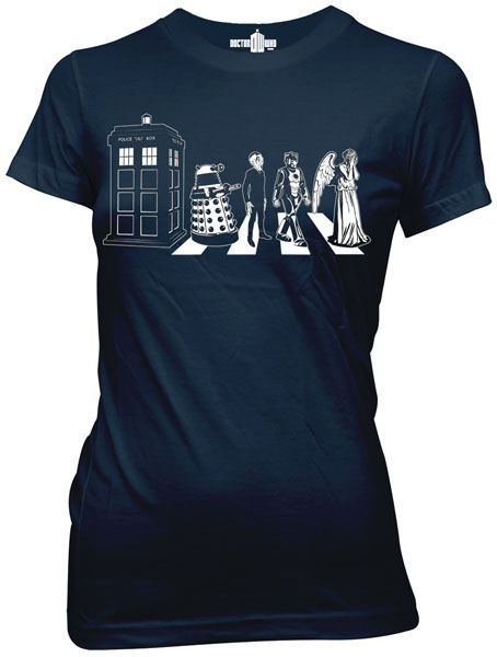 This is a navy blue baby doll/juniors women’s style t-shirt bearing the images of a Dalek, The Silence, a Cyberman and a Weeping Angel walking across the street in front of the Tardis in a spoof of The Beatles Abbey Road album cover, from the long running British sci-fi TV series Doctor Who. This is a new, never worn t-shirt. It has been stored in a smoke and pet free environment.