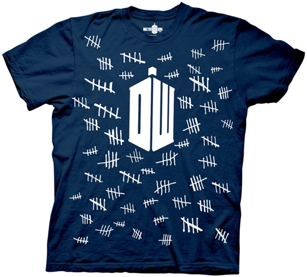 This is a navy blue t-shirt bearing the image of the new DW logo surrounded by tally marks from the long running British sci-fi TV series Doctor Who. This is a new, never worn, t-shirt. It has been stored in a smoke and pet free environment.