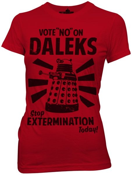 This is a dark red baby doll t-shirt bearing the image of a Dalek and surrounded by the words “Vote NO On Daleks, Stop Extermination Today!, from the long running British sci-fi TV series Doctor Who. This is a new, never worn baby doll t-shirt. It has been stored in a smoke and pet free environment.