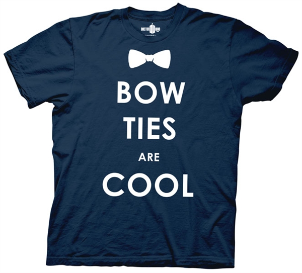This is a navy blue t-shirt bearing the art image of a bow tie under the neck and underneath the words “Bow Ties Are Cool” as said (and worn) by the 11th Doctor on the hit British TV series Doctor Who. It is a new, never worn t-shirt. It has been stored in a smoke and pet free environment.