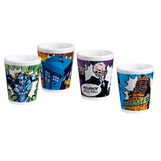 Produced by Vandor in 2014 this is a set of 4 2 ounce ceramic shot mini glasses featuring classic comic art images from the comic book adventures of Doctor Who based on the long running British TV series. This shot glass set is new, unused with a photo quality design, comes in an illustrated box and is hand wash only. It is stored in a smoke and pet free environment.