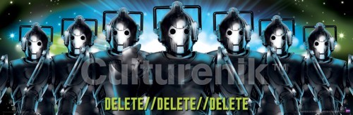 Printed in 2011 by Culturenik, this horizontal poster depicts the Doctor’s enemy the Cybermen over their catch word Delete/Delete/Delete as seen on the long-running and highly popular British science fiction TV series Doctor Who. This poster is a new, unused copy that comes rolled and is shipped in a protective tube. It has been stored in a smoke and pet free environment.