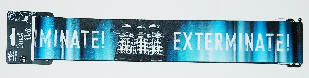 This is a 2.75″ wide cinch belt featuring the image of Daleks and the word Exterminate from the long running British sci-fi TV series Doctor Who. Made from a heavy duty stretchable nylon, it has a sliding buckle with the image repeating for the entire length of the belt. It is available in two sizes: small/medium which is 28″ long unstretched and medium/large which is 35″ unstretched. They each have around 5-6 inches of expansion as needed. They are new and unused and have been stored in a smoke and pet free environment.