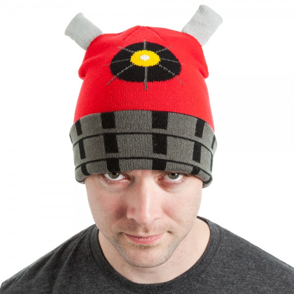 This is a red beanie hat in the image of a Drone Dalek as seen on the long running British sci-fi TV series Doctor Who.