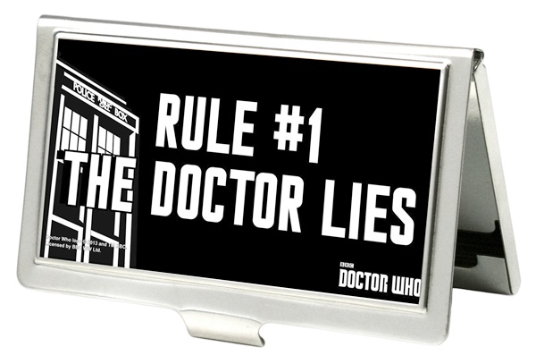 This is metal business card holder featuring the art image of the Tardis on the left beside the phrase “Rule #1 The Doctor Lies” from the long running British TV series Doctor Who. It has a slide in compartment to keep business cards secure, the inside top is so clear and shiny it can be used as a mirror, and it measures 3.75″ x 2.25″ x 3/8″ thick. It is a new, unused card holder that comes in a protective box and is stored in a smoke and pet free environment.