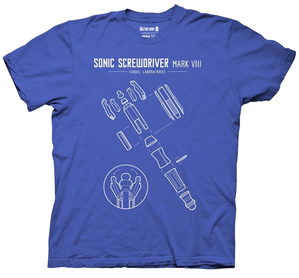 This is a blue t-shirt bearing the image of the Sonic Screwdriver Mark VIII’s diagram and the words “Sonic Screwdriver Mark VIII, Tardis Laboratories” across the top of the shirt, from the long running British sci-fi TV series Doctor Who. This is a new, never worn t-shirt. It has been stored in a smoke and pet free environment.