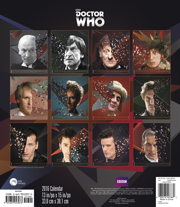 This is the 2016, 12 month large wall calendar with images of all of the Doctors from the popular cult British TV Series Doctor Who. This calendar follows the Doctors in chronological order from the first to the introduction of the twelfth. A true collector’s edition! Features reference grids. Printed on a glossy paper stock. This spiral-bound calendar is 13″ wide x 15″ tall. This is a mint, unused, spiral bound copy, printed by Day Dream Publishing, that comes in an illustrated folder, stored in a smoke and pet free environment.