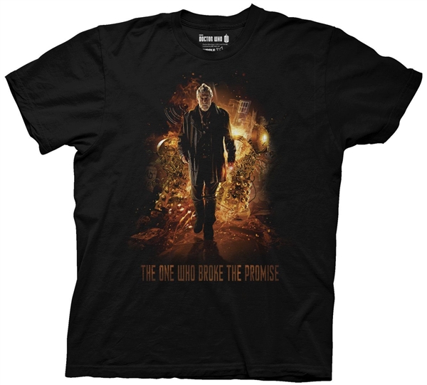 This is a black t-shirt featuring John Hurt the “War Doctor” above the words “The one who broke the promise” as seen in Doctor Who The Day of the Doctor 50th anniversary special. This is a new, never worn t-shirt. It has been stored in a smoke and pet free environment.