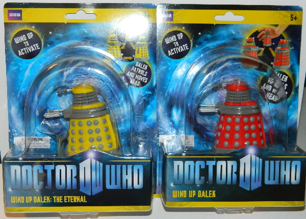 Produced in 2011 by a British company, this is a a pair of 3 1/2″ high reproductions of the Doctor’s worst enemy, Daleks, featuring and red and the yellow “The Eternal” version. Wind up the Dalek to activate it and watch it patrol around menacingly, moving its head from left to right as it seeks out life forms to exterminate. They are mint in sealed blisters.