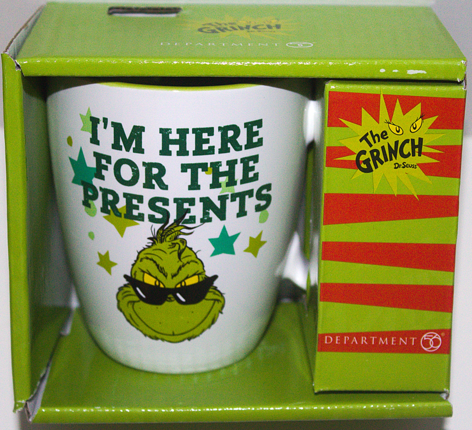 This is a new and unused yellow and green stoneware ceramic mug featuring a two sided design from the classic animated TV movie Dr. Seuss story How The Grinch Stole Christmas. It features the Grinch head under the words “I’m Here For the Presents”. This mug has a photo quality design and is NOT dishwasher safe. It comes in a full color gift box and is stored in a smoke and pet free environment.