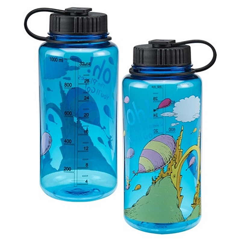 This is a 32 ounce blue tinted Eastman Tritan plastic water bottle featuring the cover art from the Dr. Seuss book, “Oh the Places You’ll Go”. It measures 4.0″ x 3.75″ x 8.25″, has Measurement marks to help track your daily intake, a Wide mouth makes it easy to clean and add ice, a Leak-proof, loop-top cap offers greater functionality On-The-Go and is BPA Free. It is new and unused, perfect for hydrating on the go. Hand wash recommended for this new unused bottle that has been stored in a smoke and pet free environment.