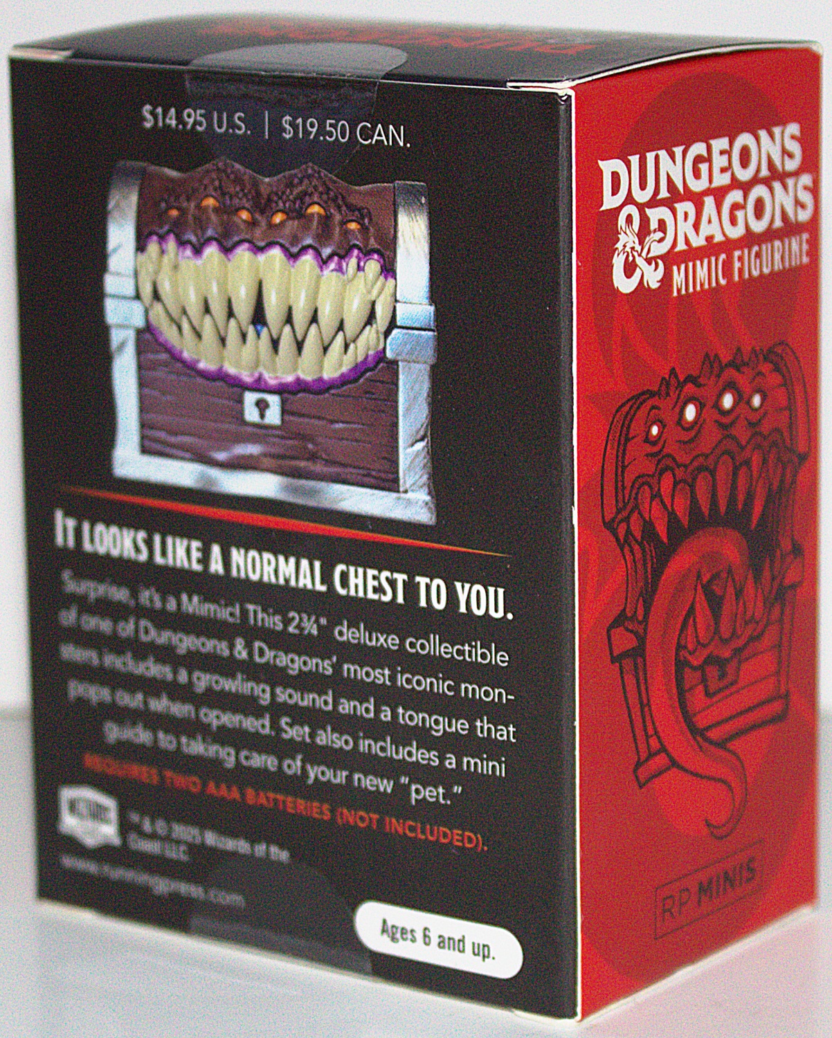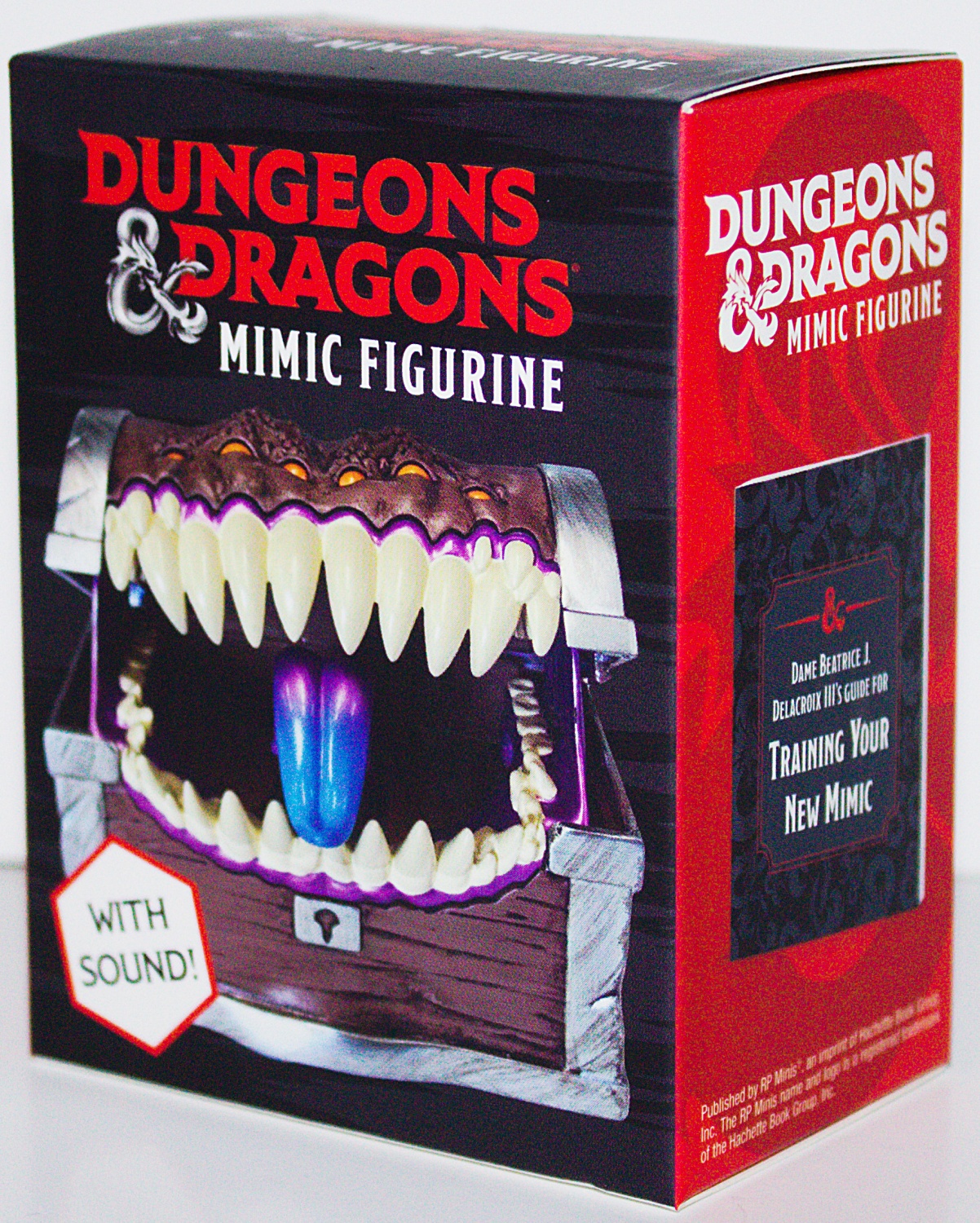 Sometimes a chest really is just a chest, but don’t turn your back on this official miniature Mimic figurine! This is a 3-inch figurine of the popular Dungeons & Dragons Mimic monster with growling sound effect. Its tongue pops out when chest is opened! Learn more about this iconic monster in the fully illustrated 32-page miniature book which has a guide to taking care of your new “pet”. This is a new, sealed copy that we purchased direct from the publisher and it has been stored in a smoke and pet free environment.