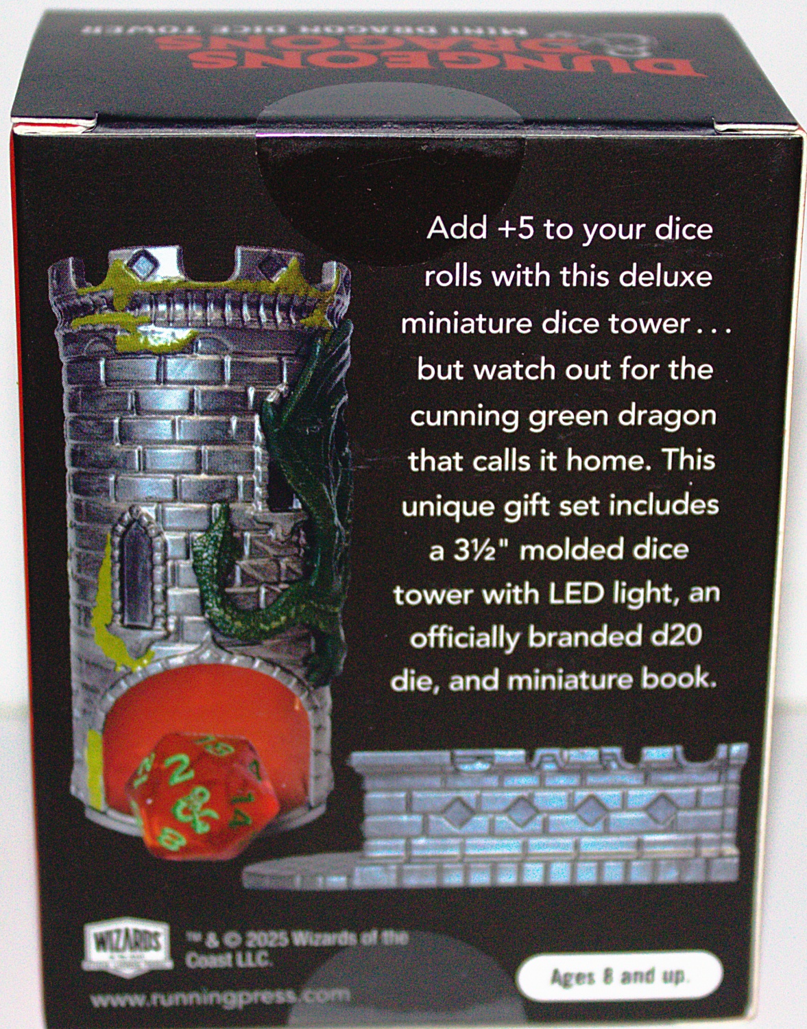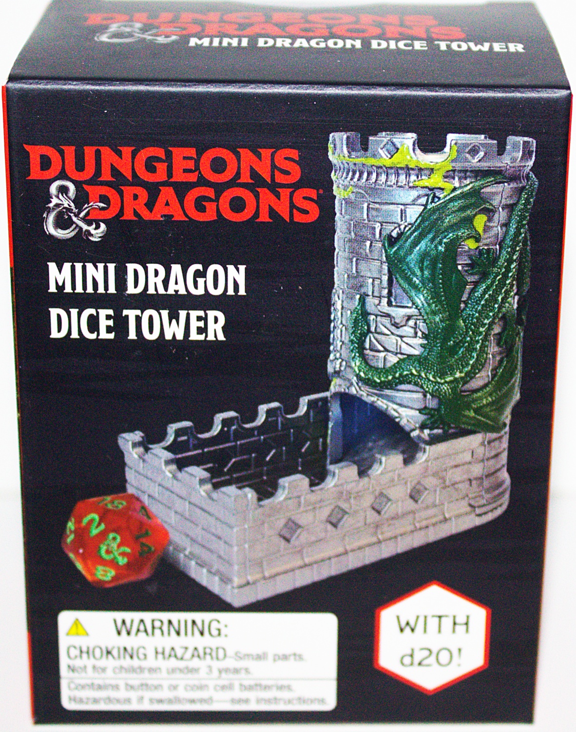 Keep your good dice rolls coming with this official miniature D&D Dragon Dice Tower. It includes a 3-1/2 inch tall dice tower with a molded green dragon wrapped around the tower, and red LED light feature. You also get a translucent d20 that is branded with the D&D ampersand for the 20, and an illustated book with tips and advice on how to use the dice tower and appease your mini dragon. Display on a shelf, desk, or bookcase and show off your love of Dungeons & Dragons. Includes 3 button cell batteries. This is a new, sealed copy that we purchased direct from the publisher and it has been stored in a smoke and pet free environment.