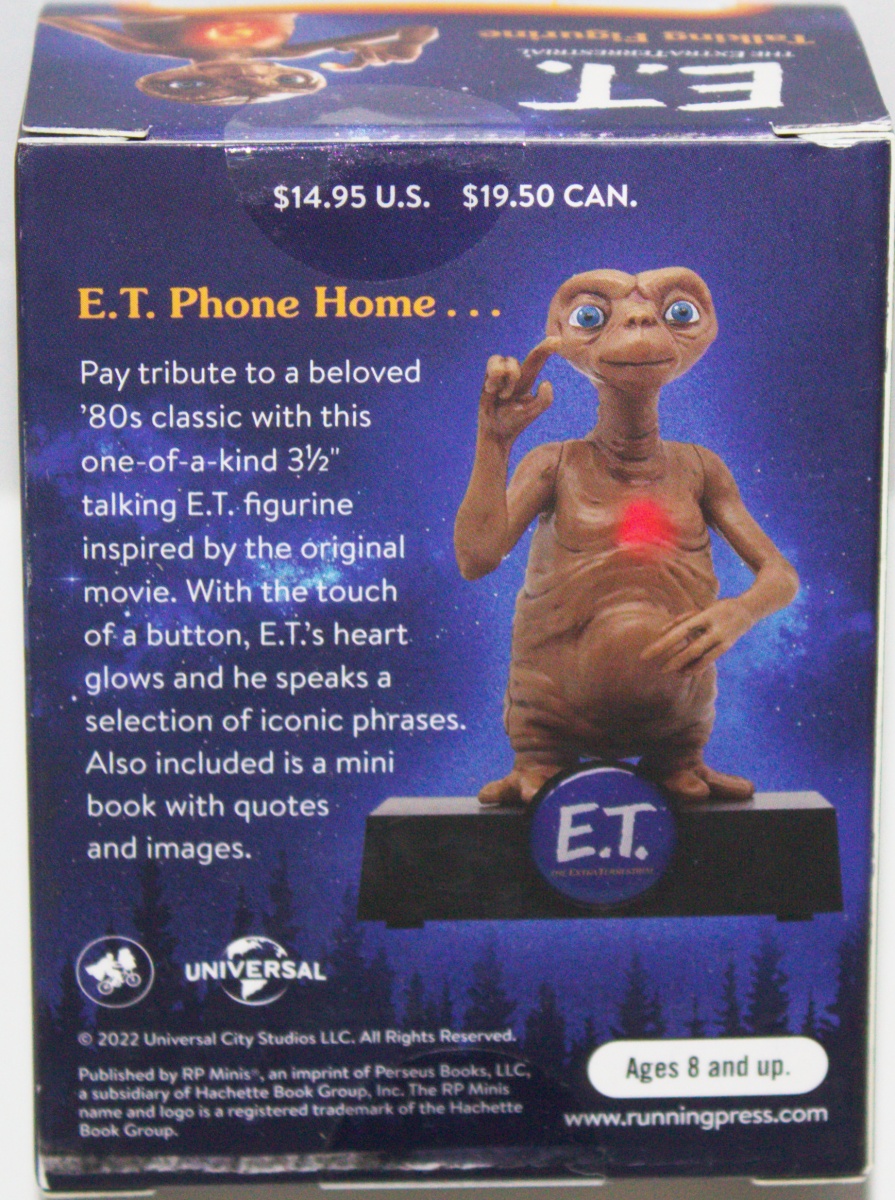“E.T. phone home” with this officially licensed kit celebrating everyone’s favorite extraterrestrial. This includes a 3.5 -inch figurine of E.T. with a light-up glowing heart and features audio of iconic E.T. phrases, including “E.T. phone home,” “Be good,” and more. There is also a 32-page book with popular quotes and images from the original film. A must-have gift for fans of E.T. This is a new, sealed copy from our files that we purchased directly from the publisher and it has been stored in a smoke and pet free environment.