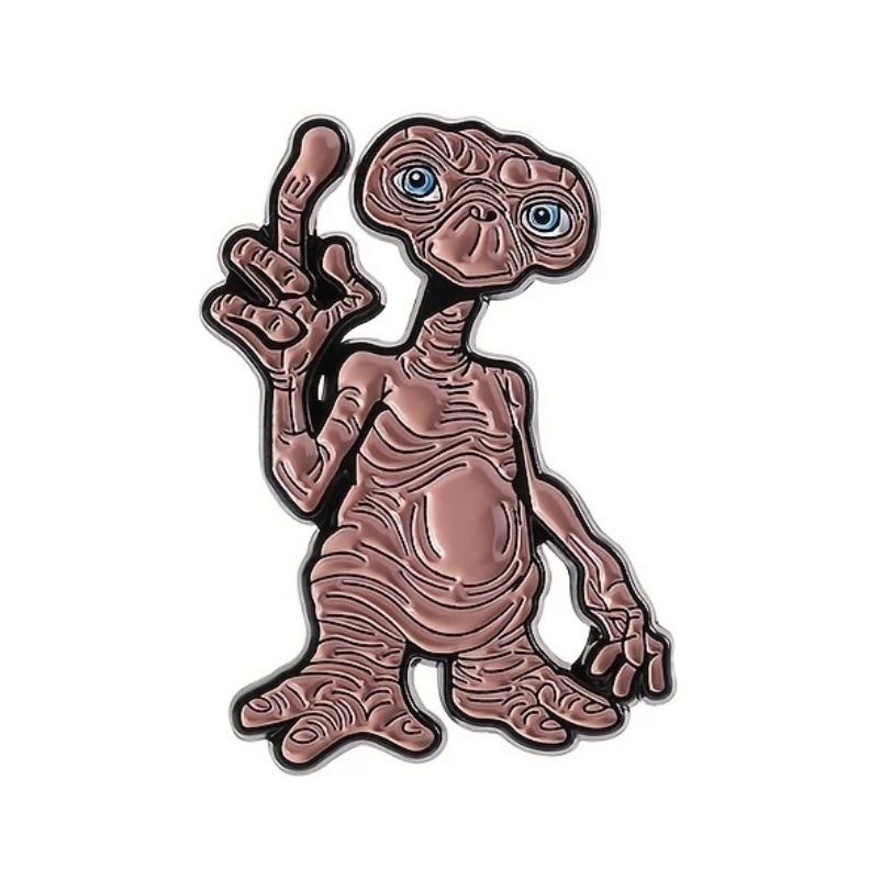 This is a metal enamel die-cut pin featuring E.T. pointing his finger upwards from the hit Steven Spielberg film E.T. The Extraterrestrial. It measures 1.375″ high x 1″ wide and is a new, unused pin stored in a smoke and pet free environment.