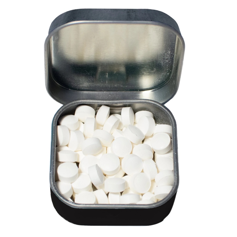 Produced by the Unemployed Philosopher’s Guild comes Einstein Relatively Strong Mints. In Albert Einstein’s Theory of Relativity, he describes gravity as a geometric property of space and time, commonly referred to as spacetime. This is not to be confused with dining, which is a combination of meals and time, commonly known as mealtime. Now, lunchtime and dinnertime can sometimes have an adverse impact on one’s breath, making it difficult to have a goodtime and leading to a lot of alonetime. And that’s where Einstein’s Relatively Strong Mints come in. After mealtime, snacktime, or anytime, eat one or two of these tasty mints and your breath will be fresh in notime. Before you know it, you’ll be having a goodtime and looking forward to bedtime. Each .4 ounce tin of mints is sealed in an illustrated box and stored in a smoke and pet free environment.
