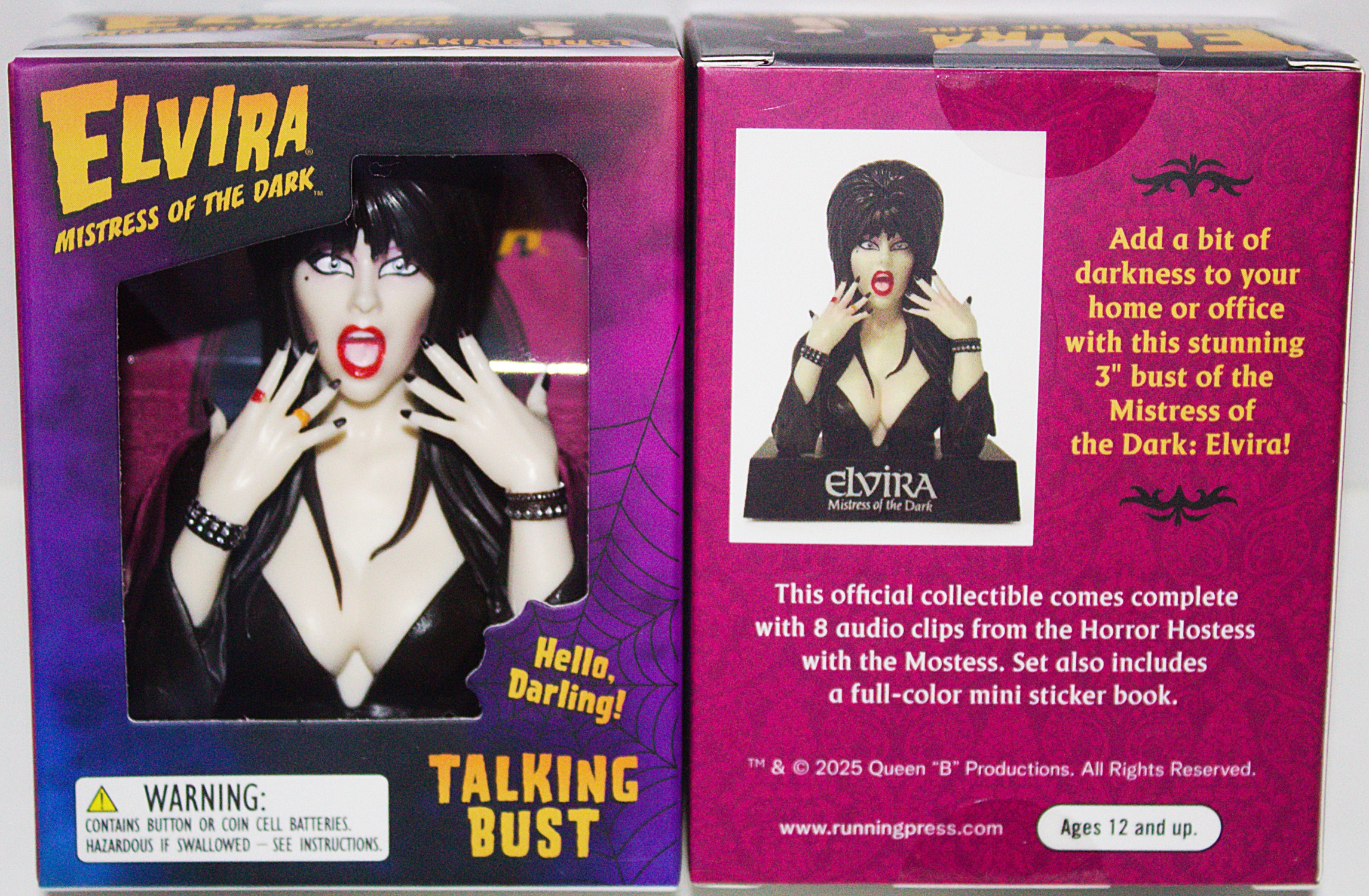 Spend a little time with horror’s hostess with the mostess, Elvira, Mistress of the Dark with this officially licensed miniature 3-inch talking bust. A 3-inch bust of Elvira that plays 8 iconic phrases at the touch of a button. Celebrate Elvira everywhere with 12 full color stickers of the Mistress of the Dark. Display on a shelf, desk, or bookcase and show off your love of this one-of-a-kind horror icon. It includes button cell batteries. This is a new, sealed copy from our files that we purchased directly from the publisher and it has been stored in a smoke and pet free environment.