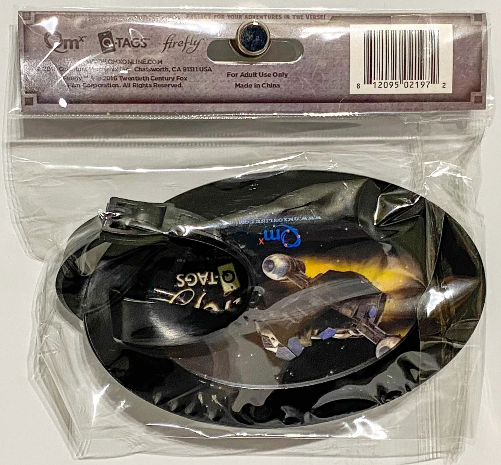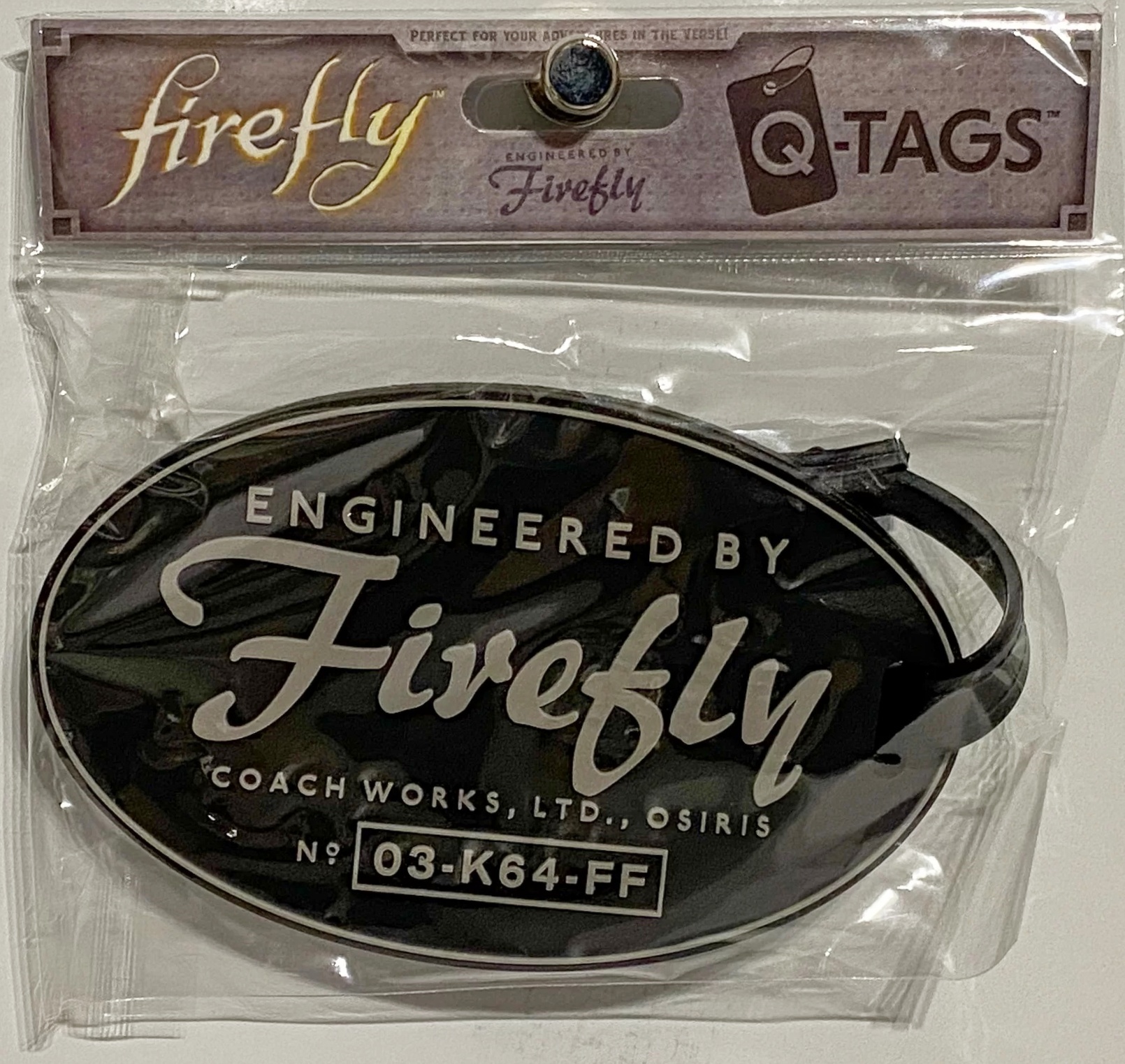 Produced by QMX in 2016, this is a molded PVC tag in the image of the builders plaque seen on the bridge of the Firefly ship from the Firefly/Serenity movie and TV series. This Engineered by Firefly Q-Tag has been created using the original file used to create the screen-used prop. This sturdy PVC tag will make you a style icon in the Verse or wherever your travels may take you. It measures 4.25″ x 2.75″, has an image of the Firefly ship on the back where a name tag can be added, and is sealed in its original packaging. It is a new, unused luggage tag, sealed in a plastic protector.