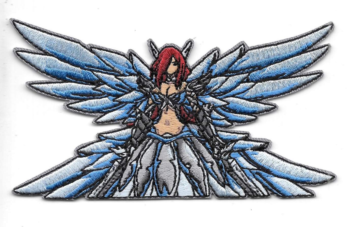This is a new unused 4.25″ wide x 2″ high embroidered patch, featuring the figure of Erza Scarlet with wings spread from the popular Japanese anime series Fairy Tail. It has been stored in a smoke and pet free environment and comes with a glue backing for easy application to a cloth surface.