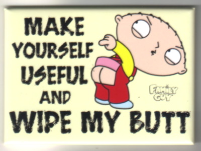 Produced in 2004, this is a licensed, large 2 1/2″ x 3 1/2″ magnet featuring Stewie saying “Make yourself useful and wipe my butt.” This is a new, unused magnet. It has been stored in a smoke and pet free environment.