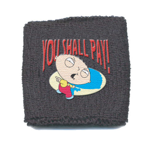 This is a black wrist sport band which features the image of Stewie with a scowl and pointing under the phrase “You Shall Pay” as seen on the hit TV show The Family Guy. It is a one size fits all, new and unused sport band, still sealed in the original packaging and now out of print. This is stored in a smoke and pet free environment.