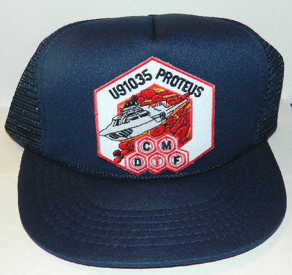This is a BLACK cloth adjustable baseball style (meaning a round bill) hat (made of 65% polyester and 35% cotton) with a 100% polyester mesh back. It has a 3 1/4″ x 3 1/2″ across patch that features the patch worn by the members of the crew of the submarine Proteus in the movie Fantastic Voyage on the front. This is a new, never worn hat stored in a smoke and pet free environment.