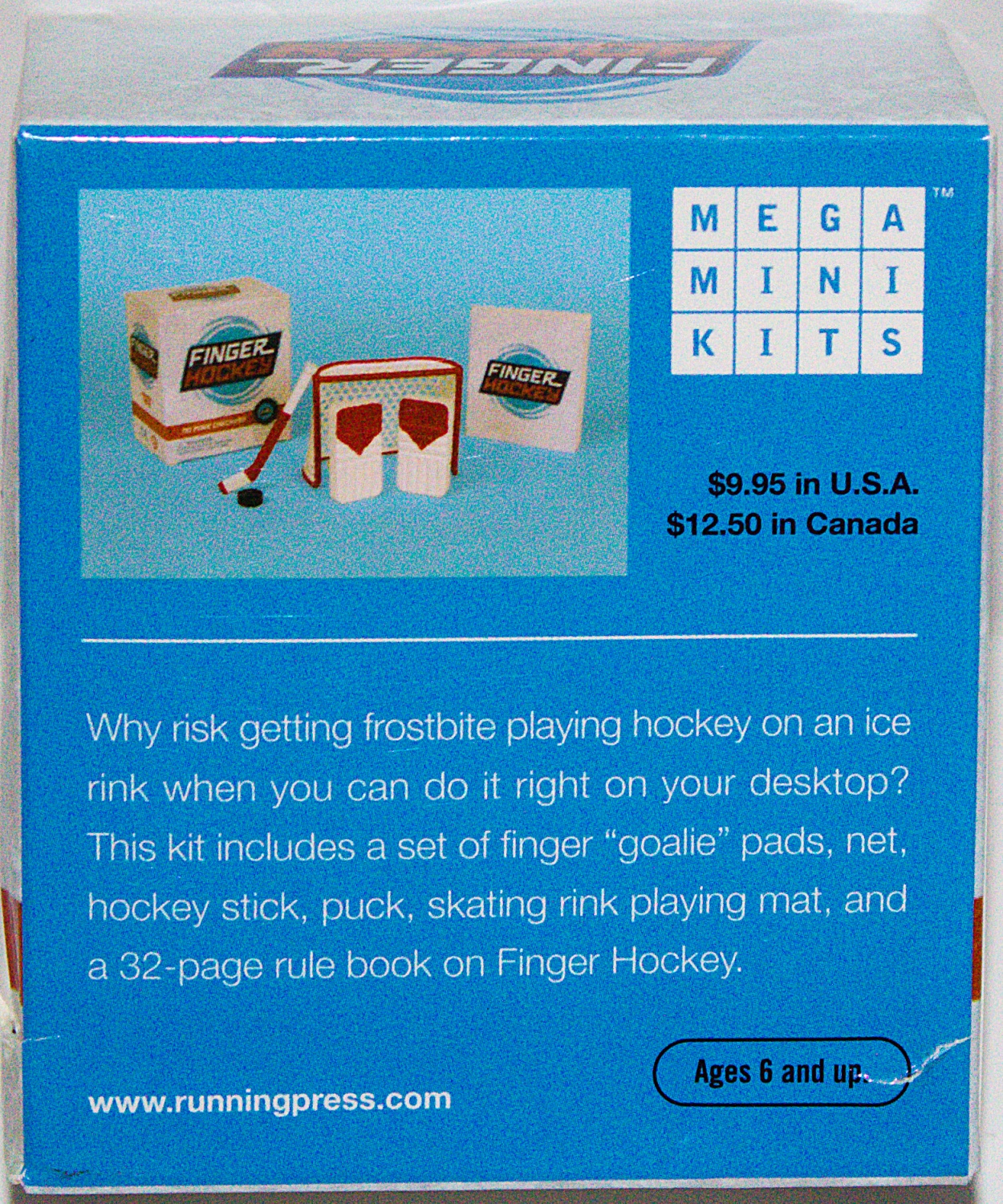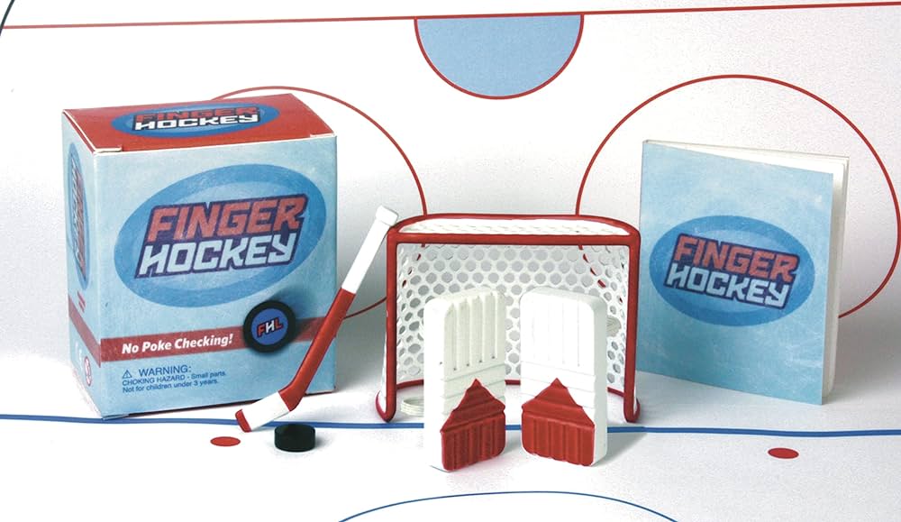 Why get bruised and bloodied playing the treacherous sport of hockey on an ice rink when you can do it right on your desktop? This is a game that the millions of rabid hockey fans around the globe will love. Kit includes a set of finger goalie” pads, net, hockey stick, puck, skating rink playing mat, and a 32-page rule book on Finger Hockey. This is a new, sealed copy that we purchased direct from the publisher and it has been stored in a smoke and pet free environment.