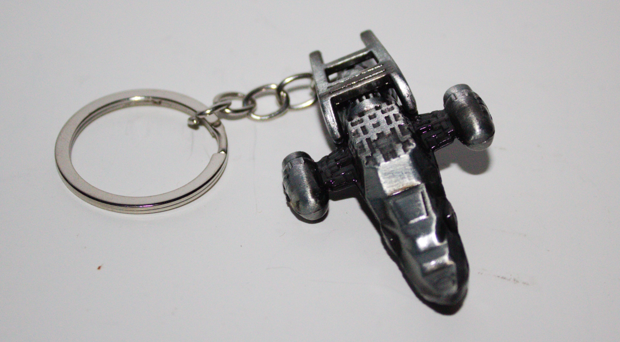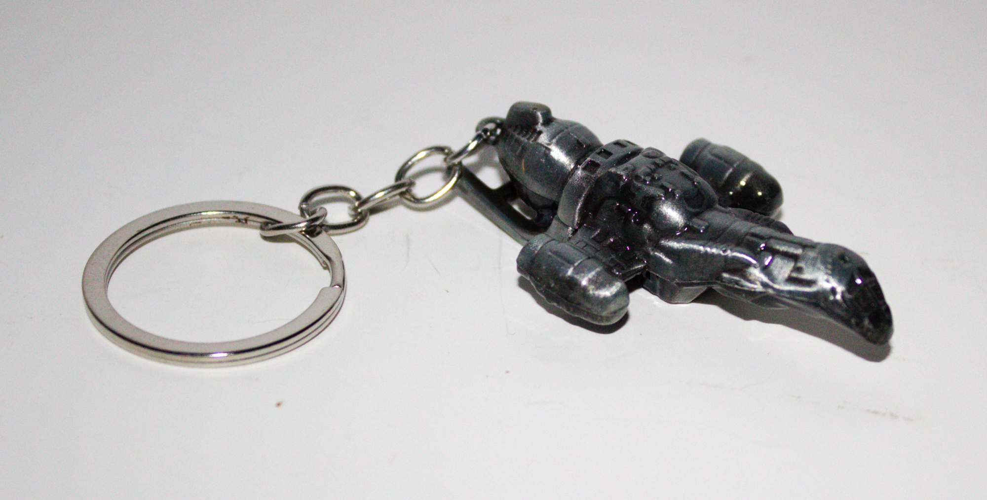 From the cult TV series Firefly, this is a 3D grey metal figure of the Serenity starship as a key chain. The ship measures 2.5″ long and .25″ thick and attached to a 2.25″ long key chain. New and unused, it is stored in a smoke and pet free environment.