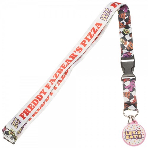This is a lanyard produced by Bioworld that features the different characters from the game along with the phrase “Freddy Fazbear’s Pizza” from the hit game Five Nights at Freddy’s. It also has a rubber charm at the end that says “Lets eat!!!”. This is a mint, unused licensed lanyard. It is stored in a smoke and pet free environment.