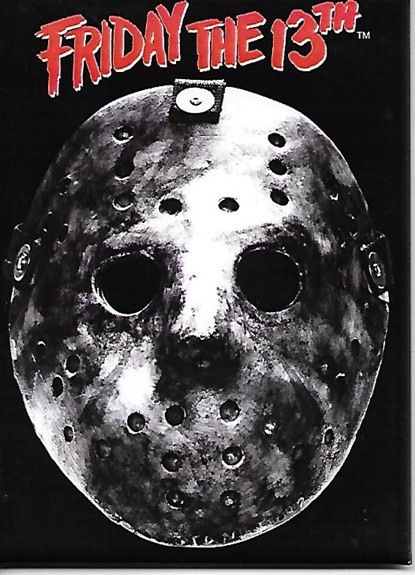 This is a licensed 2.5″ x 3.5″ magnet featuring a close-up view of the hockey mask worn by Jason on a black background in the cult sci-fi horror movie series Friday the 13th. This is a new unused magnet and it is stored in a smoke and pet free environment.