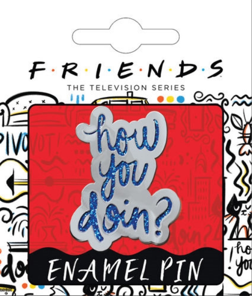Produced by ATA-BOY, this is a 1.125″ wide x .875″ high metal enamel pin that features Joey’s phrase “How You Doin?” from the hit TV series Friends. This is a new, never used pin still attached to its header display card and stored in a smoke and pet free environment.