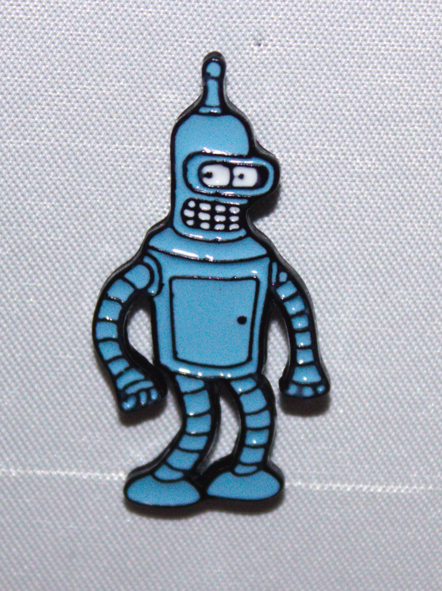 This is a 1.5″ high metal enamel lapel pin which depicts the standing image of the robot Bender as seen on the hit animated TV series Futurama. This is a mint, unused pin stored in a smoke and pet free environment.