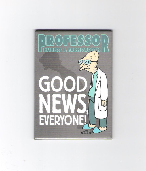Produced in 2011, this is a licensed, large 2.5″ x 3.5″ magnet featuring Professor Farnsworth from the animated series Futurama from the creator of The Simpsons. He is saying “Good News Everyone!”. This is a new, unused magnet stored in a smoke and pet free environment.