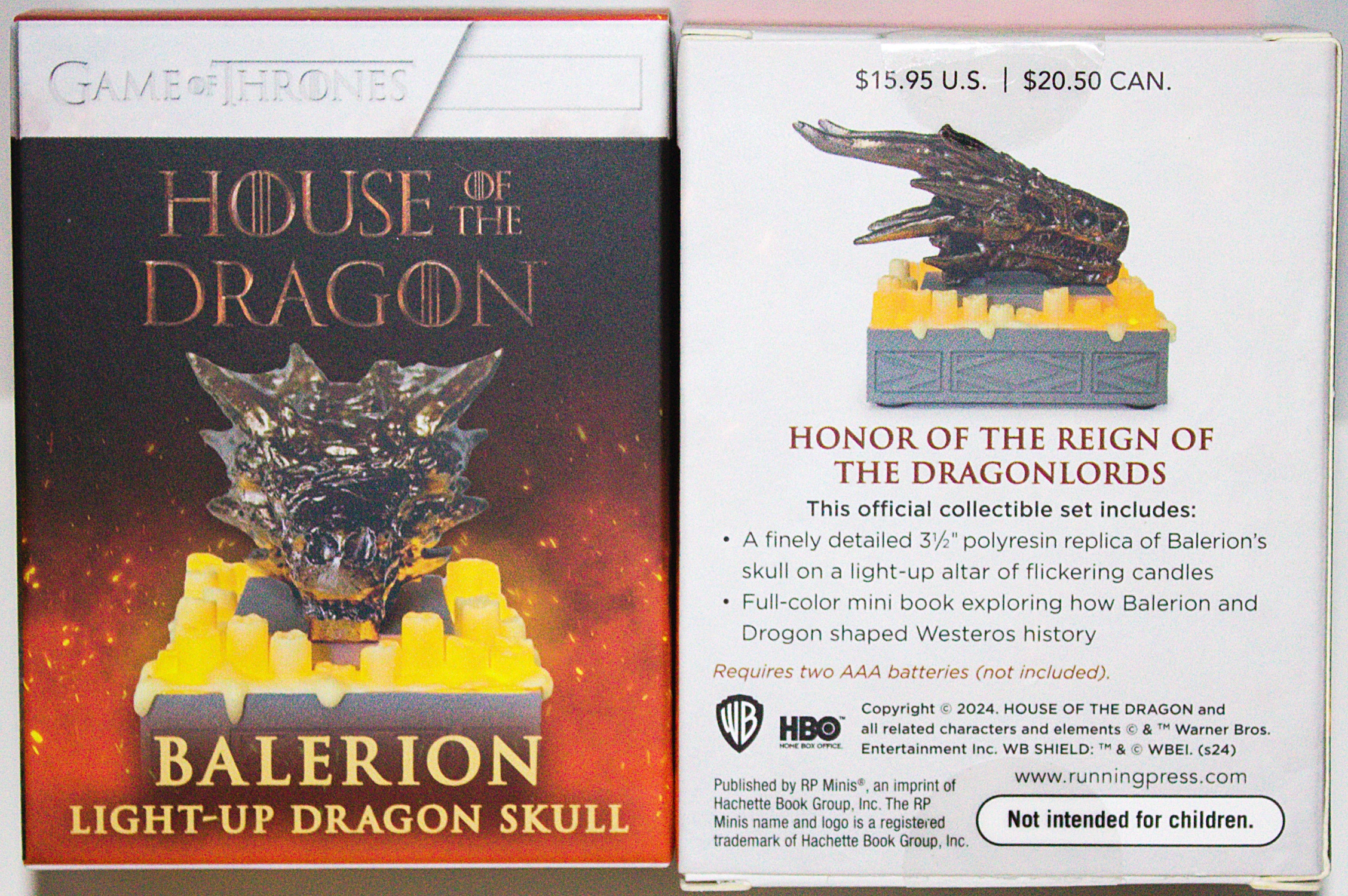 Pay tribute to the legendary dragon key to the reign of House Targaryen with this official collectible set! This is a finely detailed, 3-inch replica of the skull of Balerion the Black Dread, the dragon ridden by Aegon the Conqueror during the War of Conquest and later ridden by King Viserys. The candle-altar above which the skull hangs is recreated with a flickering, glowing base. It also includes a 32-page book featuring full-color photos that highlights the Targaryen dynasty and its relationship with dragons. Requires two AAA batteries (not included). This is a new, sealed copy from our files that we purchased directly from the publisher and it has been stored in a smoke and pet free environment.