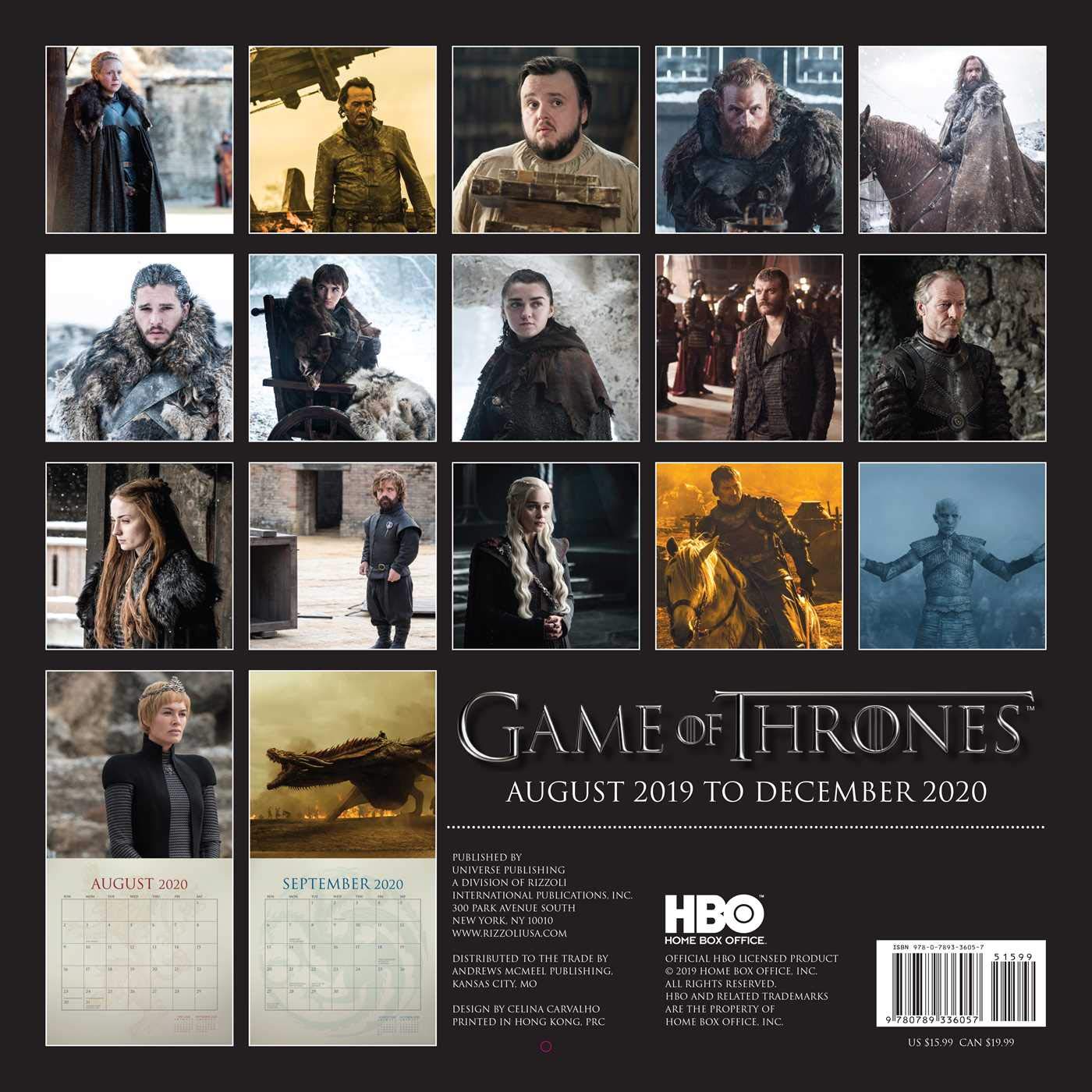 The Game of Thrones 2020 Wall Calendar features images of one of the most talked-about and celebrated casts on television, including Peter Dinklage, Emilia Clarke, Lena Headey, and more. Summers span decades. Winters can last a lifetime. And the struggle for the Iron Throne has begun. It will stretch from the south – where heat breeds plots, lusts, and intrigues – to the vast and savage eastern lands and all the way to the frozen north, where an 800-foot wall of ice protects the kingdom from the dark forces that lie beyond. Kings and queens, knights and renegades, liars, lords, and honest men…all will play the Game of Thrones, an original series based on George R.R. Martin’s best-selling A Song of Ice and Fire series. This is a mint, unused, original shrink-wrap copy, printed by Universe Publishing and stored in a smoke and pet free environment. The photo is for identification only but you will receive one as described.