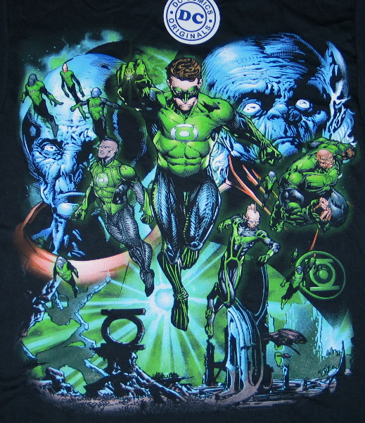 This is a black t-shirt, featuring a montage of Green Lanterns and Guardians in a body print design. This is a new, never worn t-shirt. It has been stored in a smoke and pet free environment.