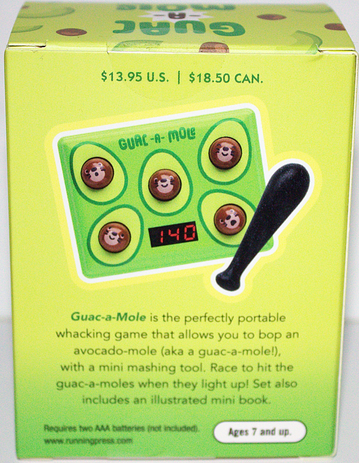 Guac-a-Mole is the perfectly portable whacking game! Race to bop the avocado-moles (aka guac-a-moles) when they light up before time runs out. This mini game measures approx. 2-3/4 x 3-3/4 inches, featuring light and sound effects. The small size allows for some guac-a-mole bopping fun anytime, anywhere. Also includes a companion mini book with full-color illustrations. Makes a great gift item for fans of guacamole and/or Whac-a-Mole. Requires two AAA batteries (not included). This is a new, sealed copy that we purchased direct from the publisher and it has been stored in a smoke and pet free environment.