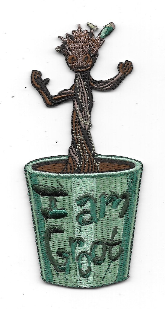 This mint, unused embroidered 4.5″ tall patch features the face of the baby Groot ina flower pot over the words I Am Groot!. He is a member of the Guardians of the Galaxy from the Marvel Comic books and hit movie. Produced for the comic book marketplace this is a difficult patch to find outside of comic book conventions and stores. It comes with a glue backing for an easy application to a cloth surface and it is stored in a smoke and pet free environment.