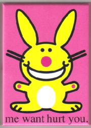 Produced in 2010, this is a licensed, large 2 1/2″ x 3 1/2″ magnet featuring It’s Happy Bunny saying “cute but psycho. things even out.”.