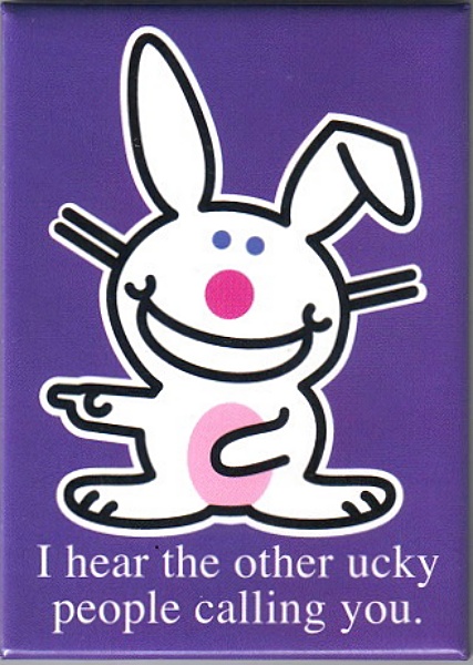 This is a licensed, large 2.5″ x 3.5″ magnet featuring It’s Happy Bunny saying “I hear the other ucky people calling you.”. This is a new, unused magnet, no longer being made, and stored in a smoke and pet free environment.