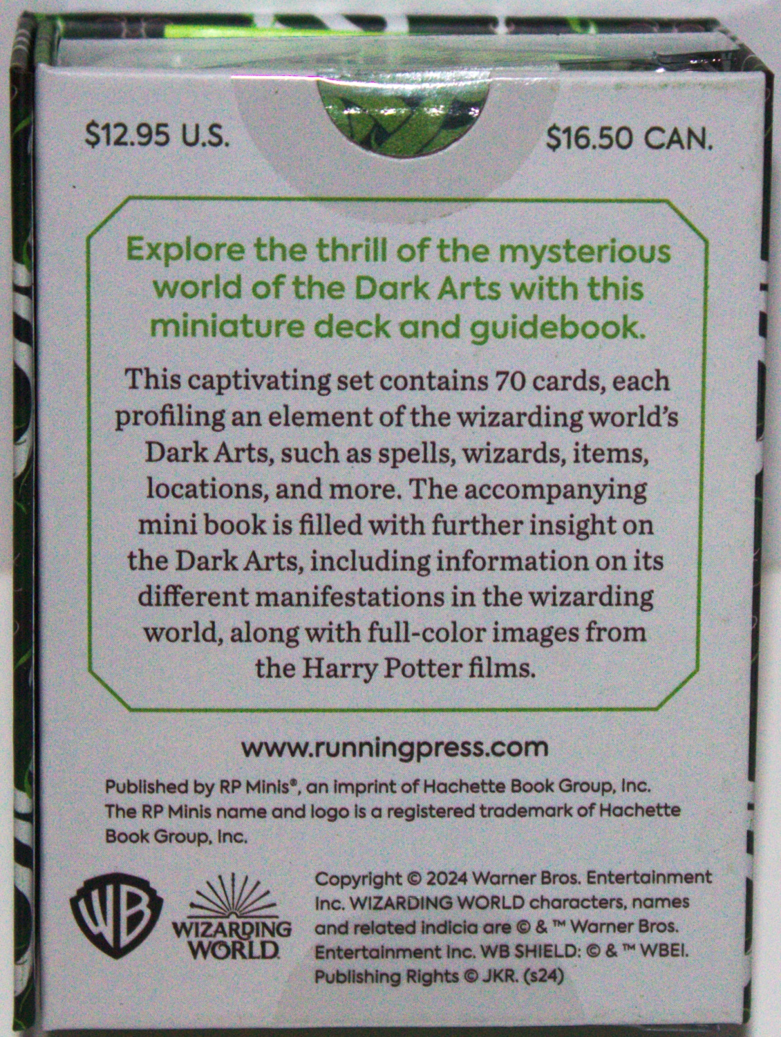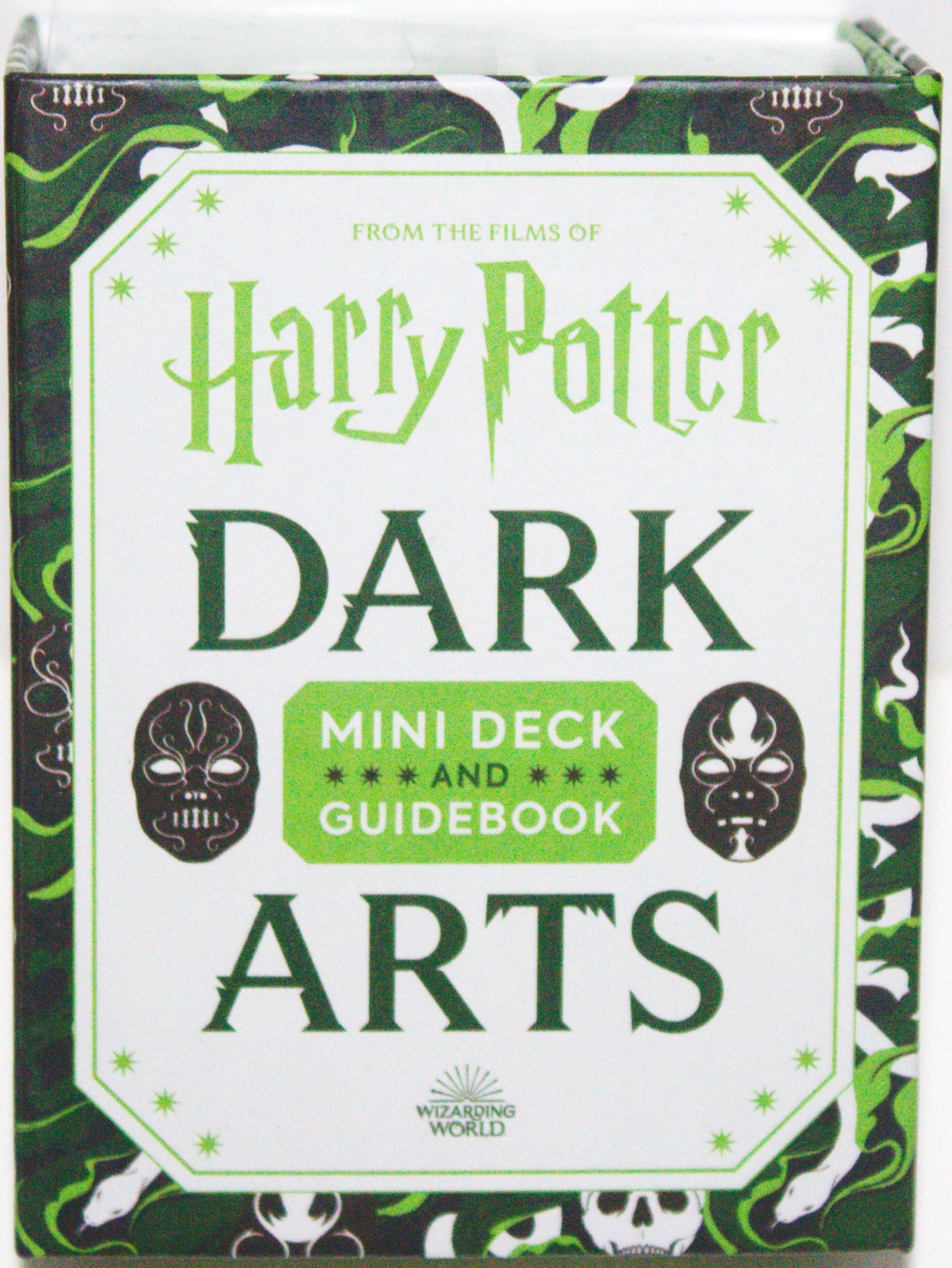 This is one of a series of mini books about Harry Potter that comes with a bonus Harry Potter item. Explore the mysterious world of the Dark Arts within the Wizarding World, with this unique, officially licensed Harry Potter Dark Arts Mini Deck and Guidebook. The kit includes: 70 Dark Arts-themed cards that are 2.5 x 3.5-inches, featuring the characters, items, spells, and more that are key to the Dark Arts. A 48-page guidebook to the world of the Dark arts, featuring full-colored images from the films. The deck and mini guidebook are housed in a keepsake magnetic closure box for travel and safe keeping. This is a new, sealed copy that we purchased direct from the publisher and it has been stored in a smoke and pet free environment.