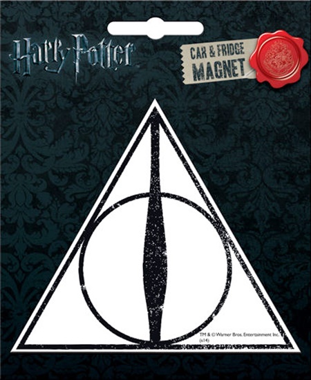 Produced by Ata-Boy in 2015, this is a licensed car magnet measuring 4″ x 3.5″ that features the image of the Deathly Hallows logo from the Harry Potter movies. This is a new, never used, magnet in a sealed display packet and stored in a smoke and pet free environment.