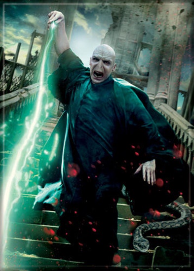 This is a licensed 2.5″ x 3.5″ magnet featuring an art image of Voldemort using his wand as seen in the Harry Potter movie The Deathly Hallows.